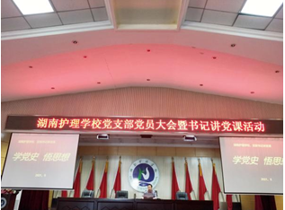 根据省、市委关于党史学习教育的统一部署,结合党史学习教育,为贯彻落实“百名书记讲党课活动”,湖南护理学校党支部于5月13日下午召开党员大会暨书记讲党课活动。本次党课由党支部书记赖青主讲,全体党员、入党积极分子、团员、班团干部参与听课.