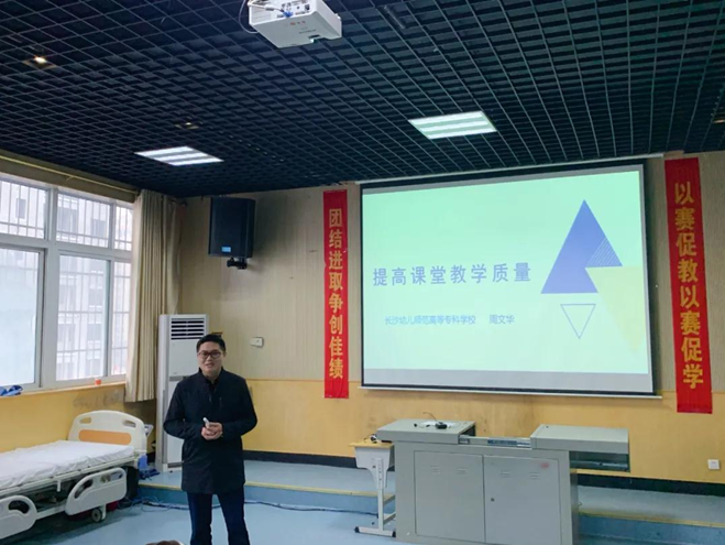 教学是学校中心工作,质量是教学的生命线,为提高我校教师课堂教学质量,2020年12月8号下午16点,特邀长沙幼儿师范高等专科学校周文华校长就“提高课堂教学质量”进行专题讲课,学校执行校长周浪舟教授,副校长曹淑媛女士出席培训会,全校教职工参加,会议由教务处副处长杨武主持。