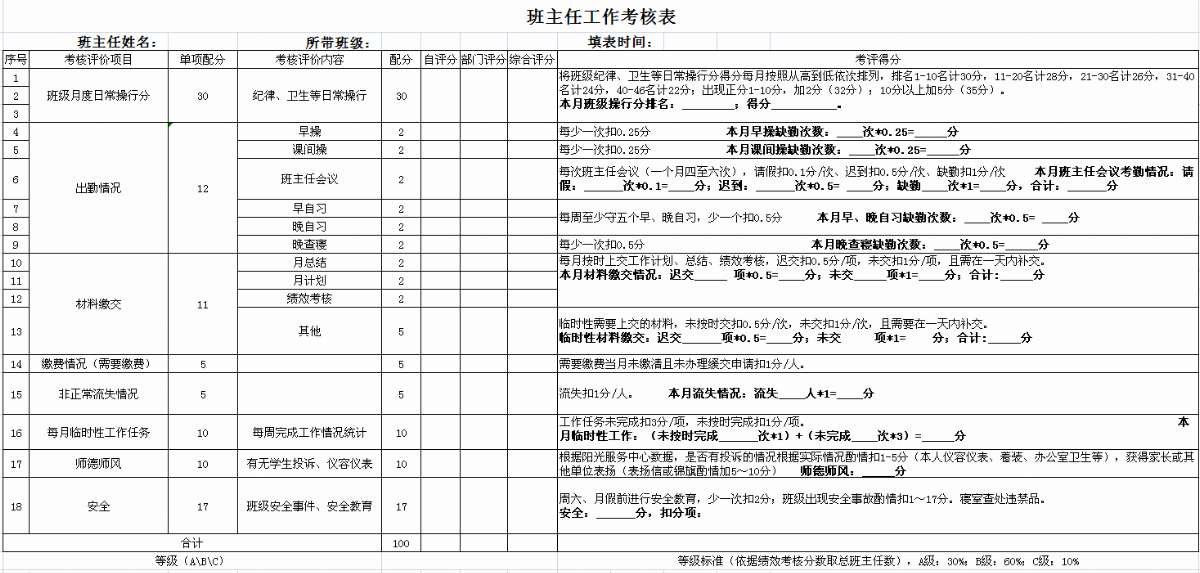 学工处班主任工作考核表