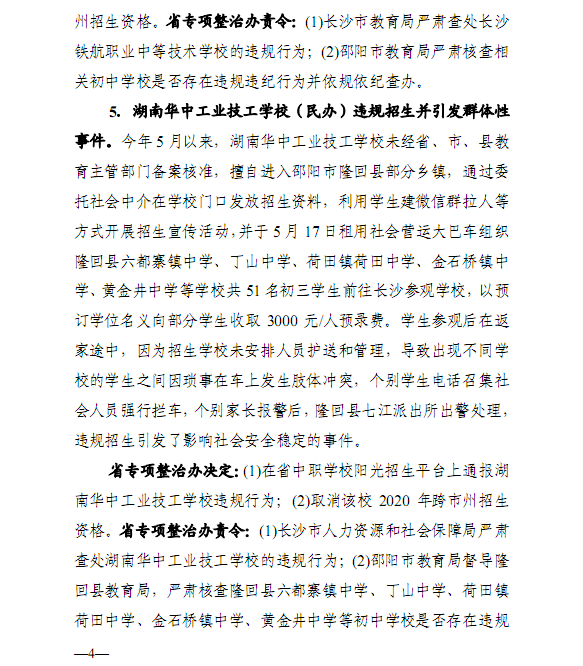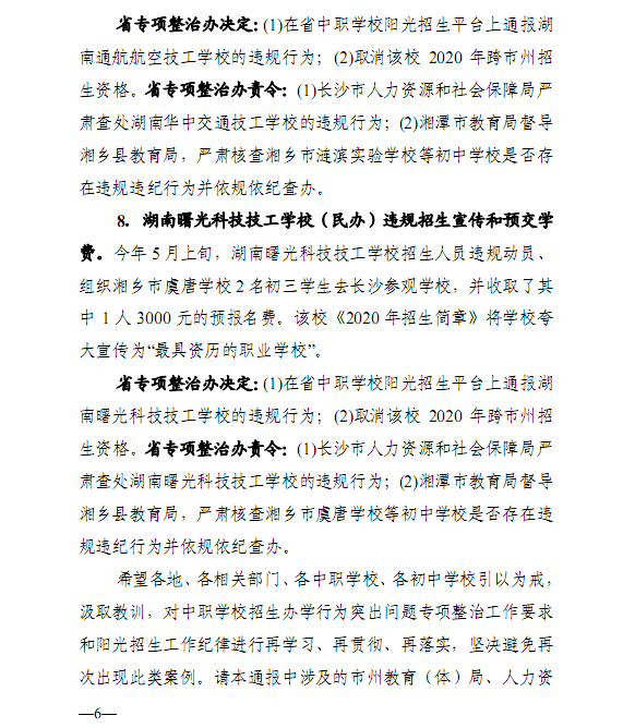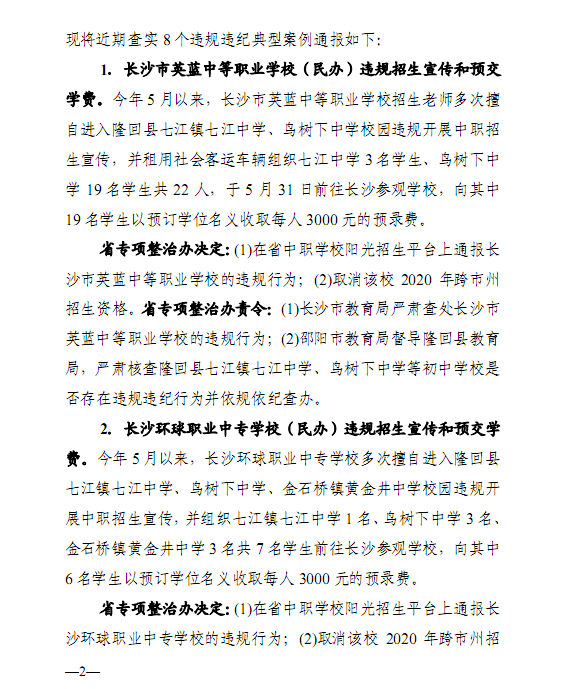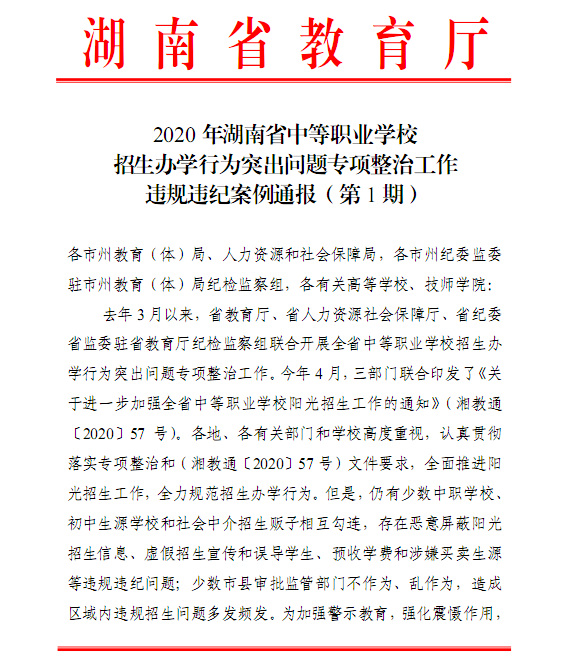 2020年湖南省中等职业学校招生办学行为突出问题专项整治工作违规违纪案例通报(第1期)