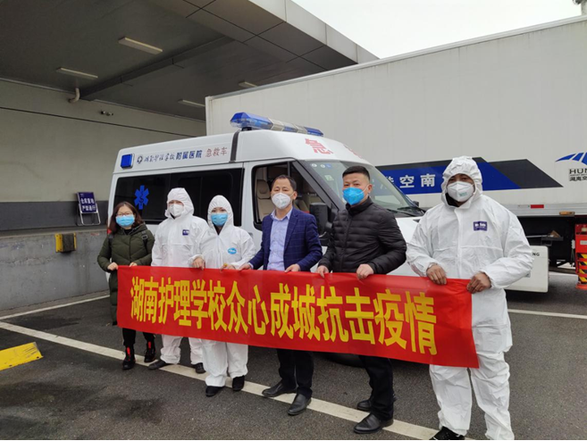 湖南护理学校校长丁志强附属医院院长王新军院长亲自整理援鄂物资。